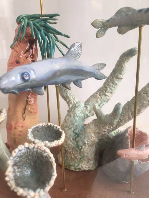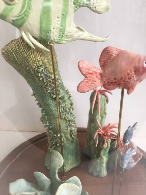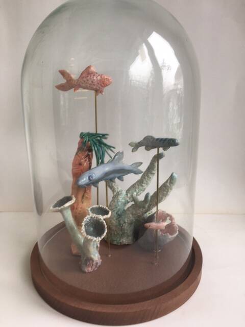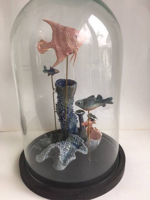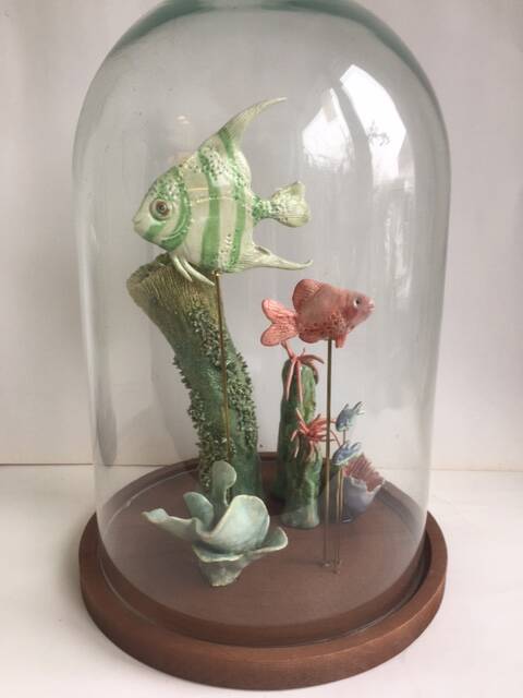 Fijne charmotte, diverse glazuur technieken, natuurlijke materialen, 14kr schildersgoud, hout en glas