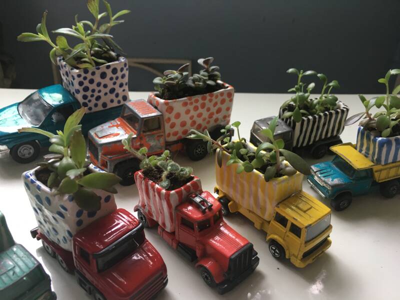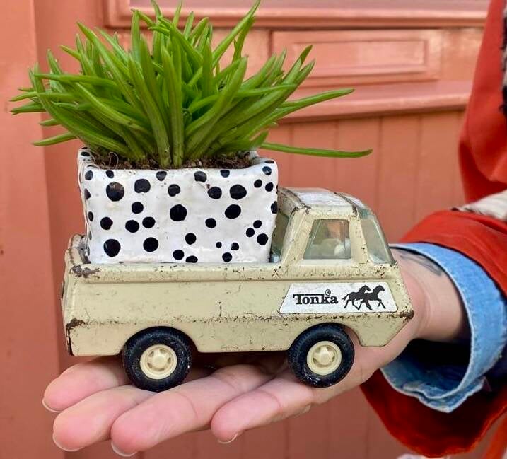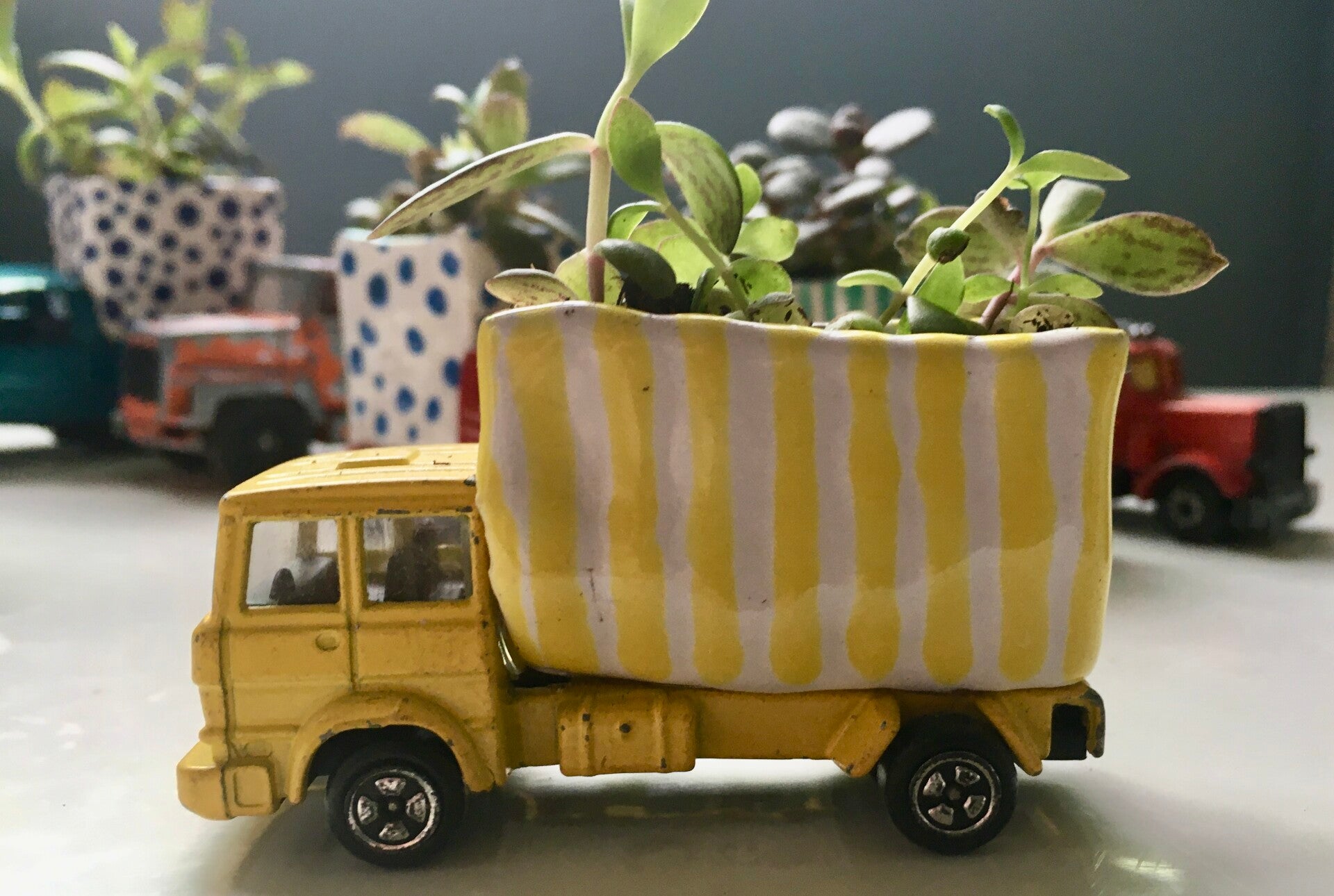 Vintage opleggertjes met keramiek plantenbakje en echt plantje